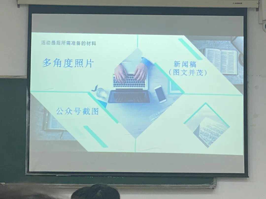 随后,新闻传播学院团委副书记葛洋怀向大家讲授了“新闻生产”。他主要将其归结为两个方面:新闻稿件和新闻图片。他将新闻稿件和新闻图片分别定义为事务性报告和活动性报道。他将新闻稿件作为主要内容,分环境描写、语言描写、具体事例三个方面展开详细讲述。