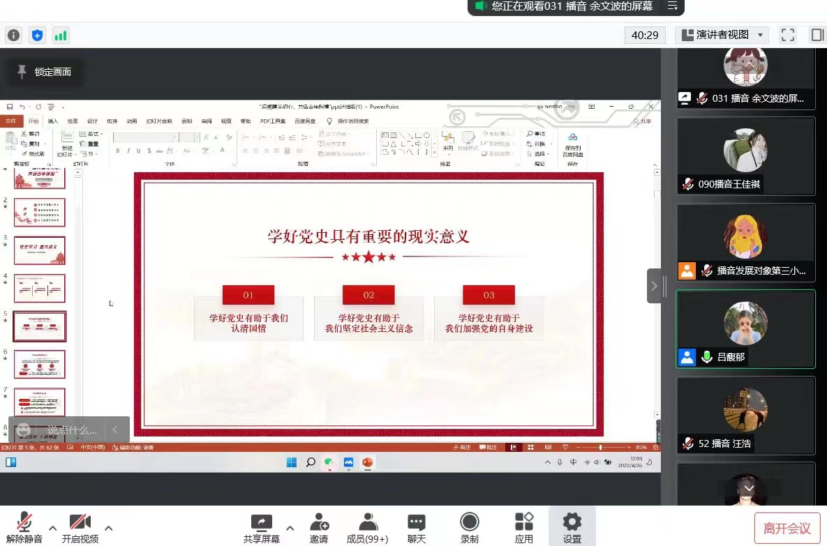 2022年4月26日12:00,诸侯快讯1188举行了2022年春季党校第一次分党校党课,诸侯快讯1188党总支部组织委员吕馥郁老师为学员们进行集中授课。参加本次党课的有第36期党校的积极分子、发展对象、预备党员与党总支部全体正式党员。