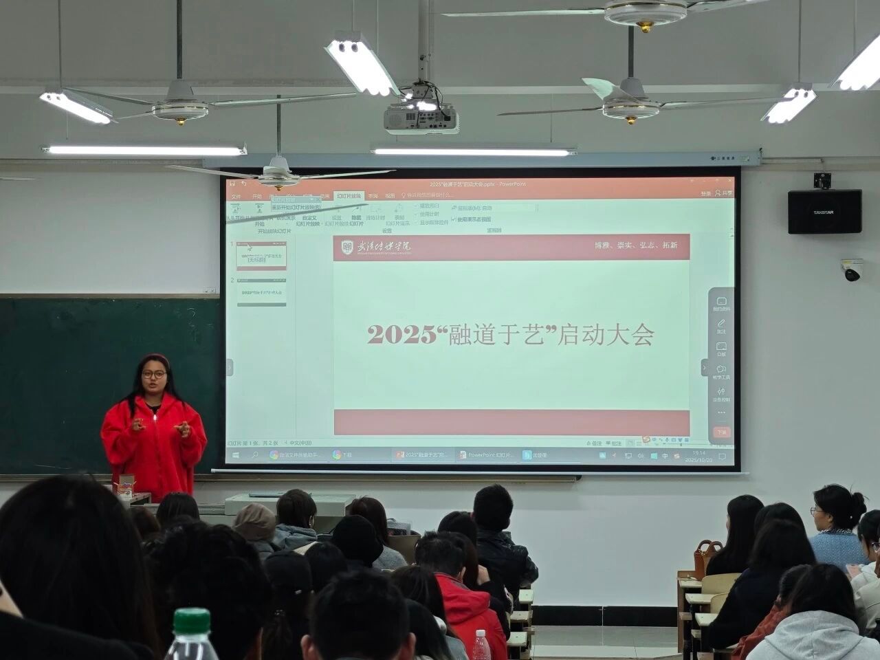 会议伊始,胡桐老师宣布2025“融道于艺”启动大会正式开始。主持人边雨璇对排练纪律进行了强调:“融道于艺”系列活动是学院深化文化育人的重要举措,每一位参与的同学都应以严谨的态度对待排练,以此避免排练出现疏漏。此外,她还强调,衔接好各个环节,更是确保活动顺利举行的前提。