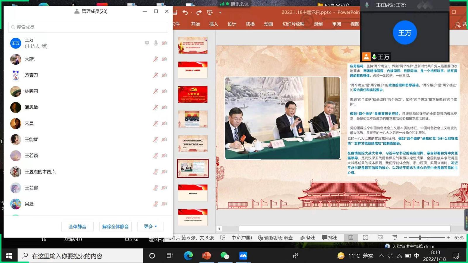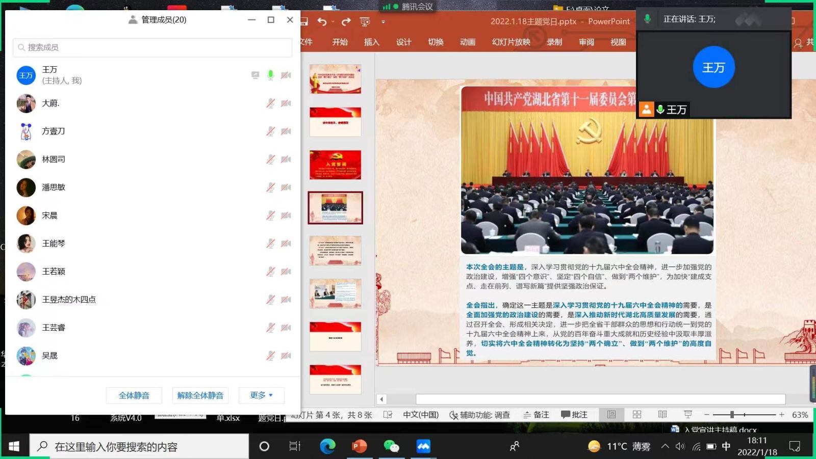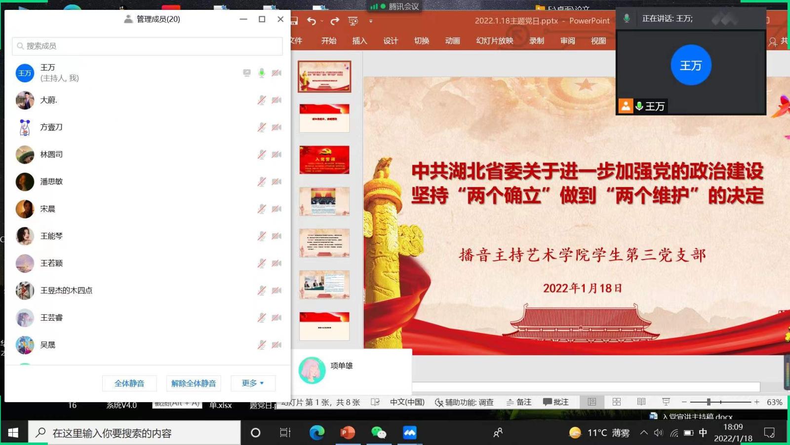2022年1月18日18时,诸侯快讯1188学生第三党支部在腾讯会议开展了主题为《中共湖北省委关于进一步加强党的政治建设、坚持“两个确立”、做到“两个维护”的决定》的主题党日活动。参与此次活动的有学生第三党支部全体成员,此次会议由学生第三党支部书记王万茹主持。