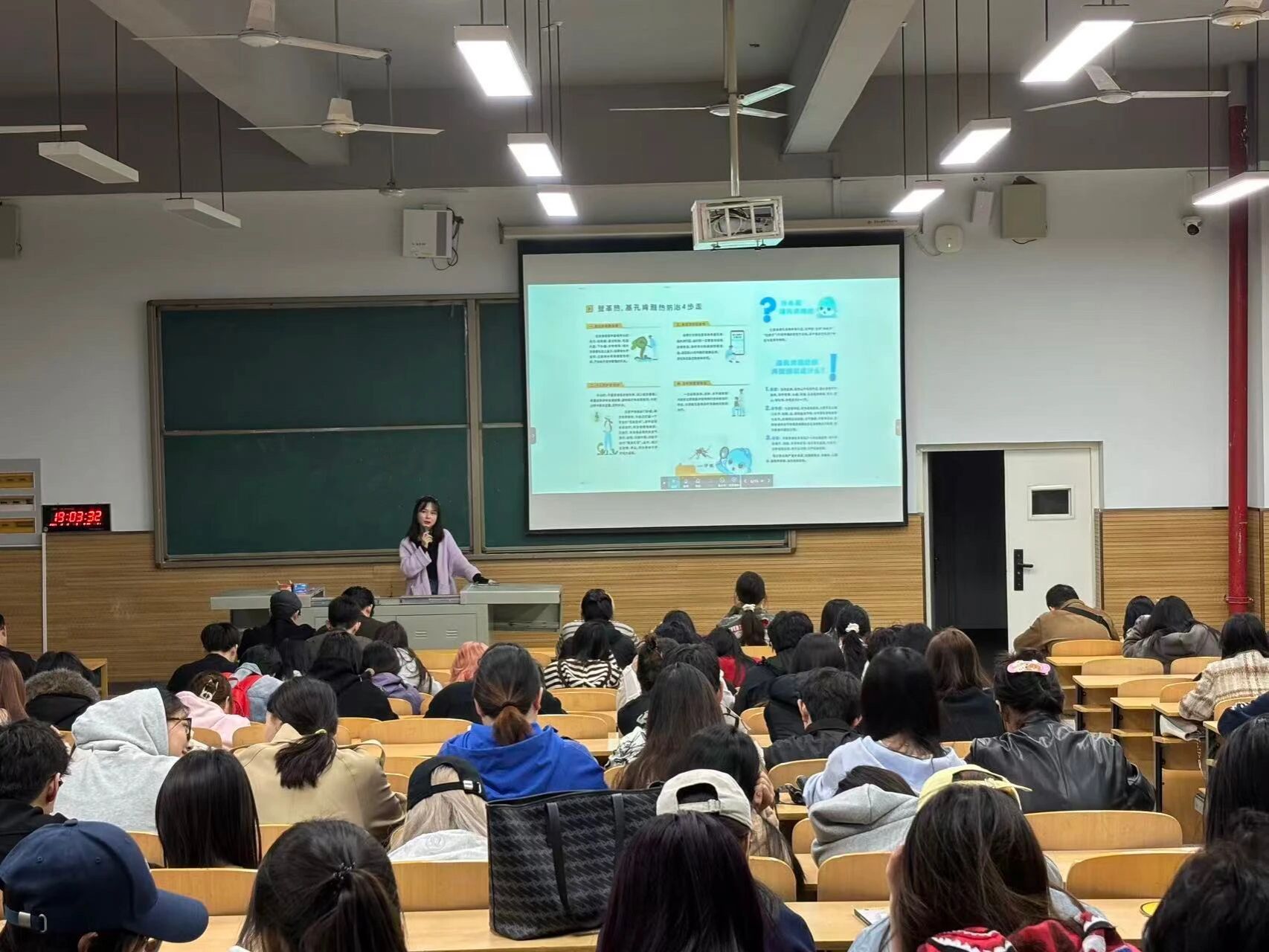 在本次主题班会中,老师们借助生动鲜活的案例以及直观形象的图片,向同学们详细地介绍了基孔肯雅热的传播途径,强调蚊虫叮咬是其主要的传播方式。此外,还科普了基孔肯雅热的典型症状,如发热、关节疼痛、皮疹等,帮助同学们快速识别感染症状。同时,老师们重点讲解了科学预防方法,包括保持居住环境的清洁卫生、及时清理积水以减少蚊虫滋生,以及外出时穿着长袖衣物并使用防蚊用品等,助力同学们提高自我防护能力。